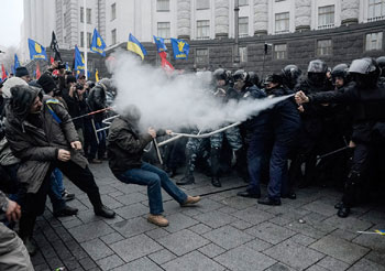 ევროპის მოედანზე შეკრებილები კი მთავრობის შენობისაკენ დაიძრნენ, სადაც აქციის გამართვა ჰქონდათ დაგეგმილი. დემონსტრანტებმა გზა გადაკეტეს, მილიციამ მათ წინააღმდეგ ცრემლსადენი გაზი გამოიყენა. შეკრებილები მთავრობის გადადგომას ითხოვენ. სამართალდამცველები აქციის მონაწილეების შენობაში შეშვებას არ აპირებენ.