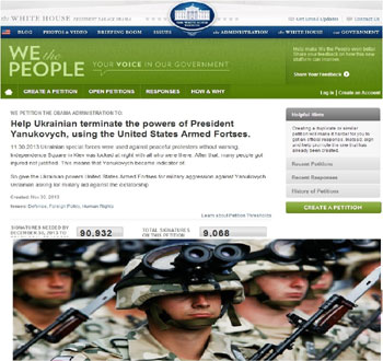 საქართველო, 2 დეკემბერი, საქინფორმი. პეტიციაში, რომელიც აშშ-ის პრეზიდენტის ოფიციალურ საიტზეა განთავსებული, ნათქვამია: „უკრაინა სამხედრო მხარდაჭერას ითხოვს დიქტატურის წინააღმდეგ, 30 ნოემბერს უკრაინის სპეცდანაყოფები მშვიდობიან მომიტინგეთა წინააღმდეგ გამოიყენეს...“