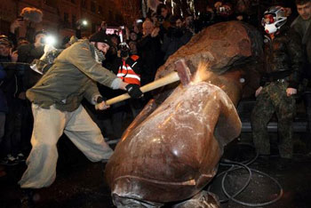 საქართველო, 9 დეკემბერი, საქინფორმი. კვირას უცნობმა ნიღბიანმა პირებმა კიევში, ბესარაბიის მოედანზე ლენინის ძეგლი ჩამოაგდეს. მილიციის პრესსამსახურში “რია ნოვოსტის” აცნობეს, რომ უცნობებს ხელში ნაციონალისტური პარტია „სვობოდას“ დროშები ეკავათ.
